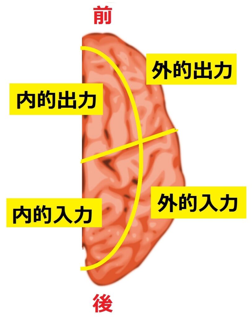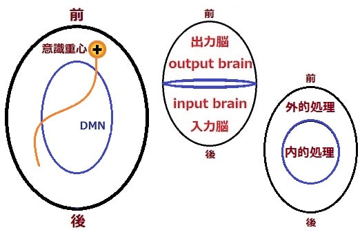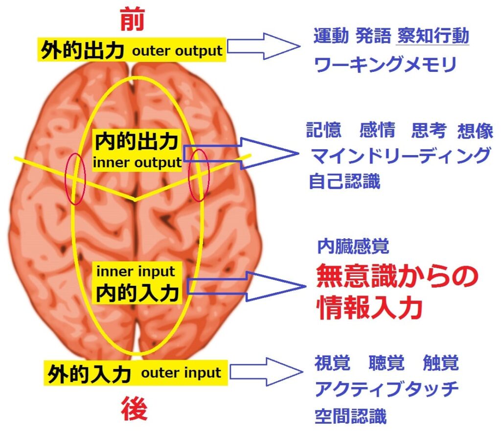 したがって脳を上から眺めた時、前方は出力(output)、後方は入力(input)を担っていることが分かる。人は出力と入力を同時に意識に捉えることはできない。また外的処理(外界の環境を知ろうとする働き)と内的処理(内界すなわち自己の内面を知ろうとする働き)もやはり同時に意識することはできない。