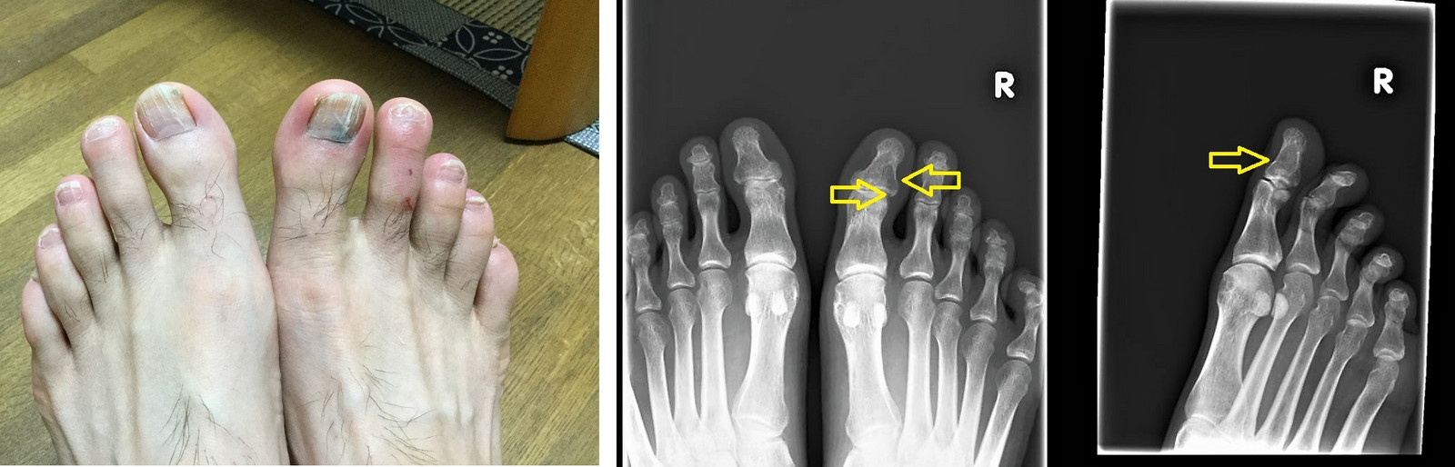 右は当院の患者症例で、自宅にて小趾を椅子に強打して受傷。整形で骨折の診断。当院には受傷2日後に来院(当会の一般講演会に参加したことがあり、その際に知った三上式プライトン固定を希望されて受診)。下の画像は患者症例のX線所見。