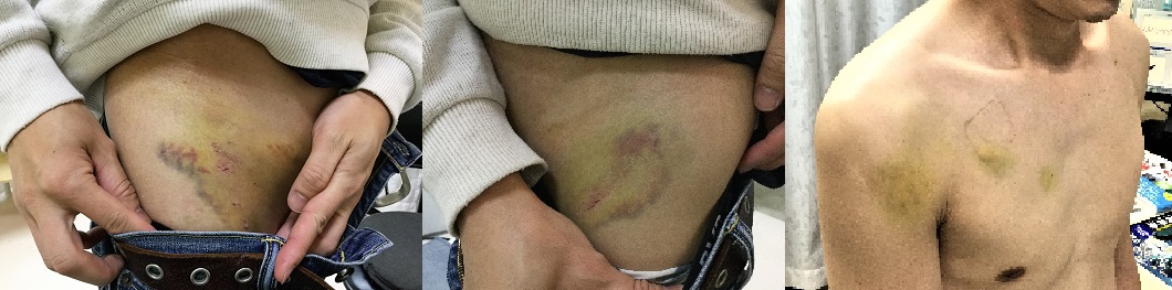 片側一車線の道路で右折しようと停車した際に、後方より2tトラックに追突され、その衝撃で対向車線に押し出され、前方から来たワゴン車と正面衝突。医療センターに救急搬送され、シートベルト圧迫による腹部内蔵への損傷が精査され、幸い異常なし。頭部CT、頭頚部~腰部XP等においても重大な損傷は確認されず、むち打ちに対する頸椎カラー固定のみを受けて帰宅。2日後、家族の薦めで当院を受診。下がそのときの皮膚所見。