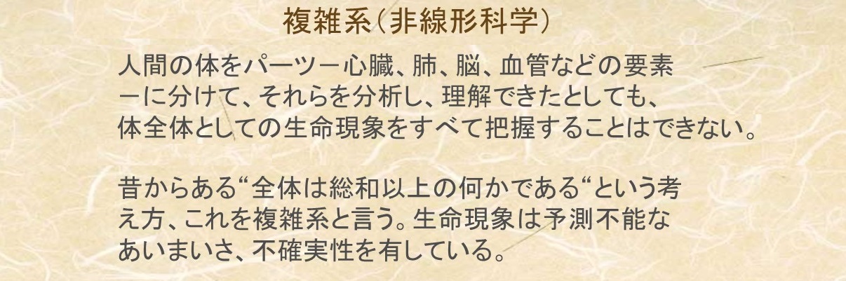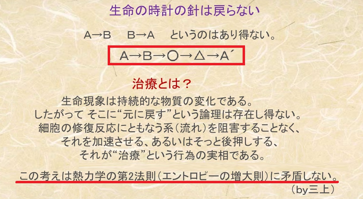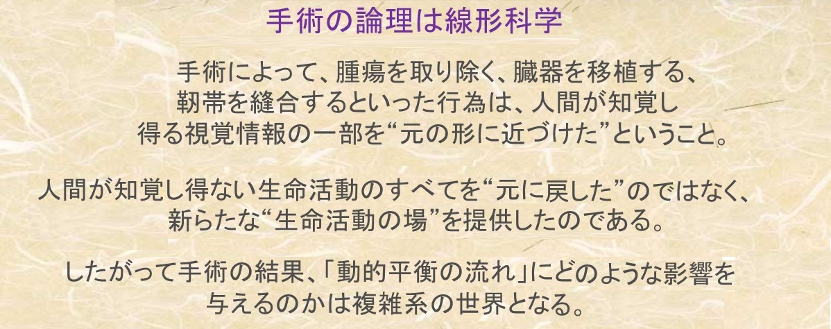 総合臨床家として培われてきた私の医療観と氏の見解は見事なまでに合致します。極めて整合性の高い解釈だと感じています。動的時間軸を無視して、静的時間軸での、つまり定点観測の結果を受けて、物質量の過不足で論じられる原因論は分かりやすく説得力がありますが、現実的には方法論で躓くケースが往々にしてあります。これは生命現象を複雑系として捉えていないことに起因する矛盾であり、痛みのハード論系に散見される陥穽でもあります。