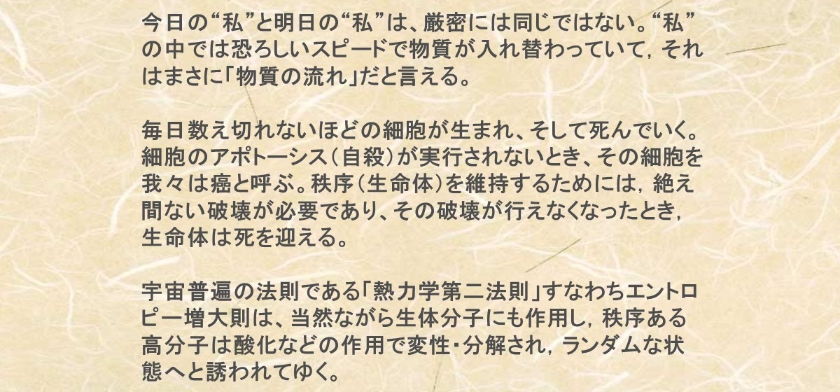 科学者にとって受け入れ難いノックアウトマウスの実験結果-あらかじめ特定の遺伝子を破壊しておいたマウスが成長して後、現れてしかるべき発病を確認できない、なぜか健康に育ってしまったというケース…-を受けて、生命とはいったい何なのか?そんな問いから生まれた福岡氏の科学者としての“ひとつの答え”…。