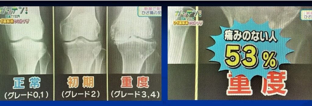 かの有名な「松代膝検診2007」~新潟県の松代地区で行われた変形性膝関節症の長期縦断疫学調査~において、膝OAのGradeⅢ&Ⅳのうち約半数の人々が無症状であることが判明し、驚きをもって報道されました。